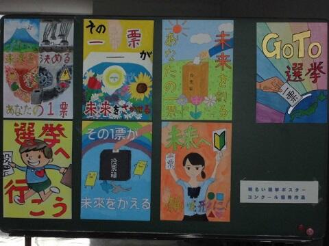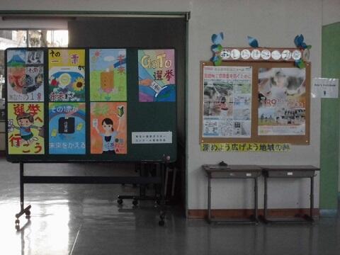 上学年昇降口に県や市の「明るい選挙啓発ポスターコンクール」で入賞した児童の作品を展示しています。