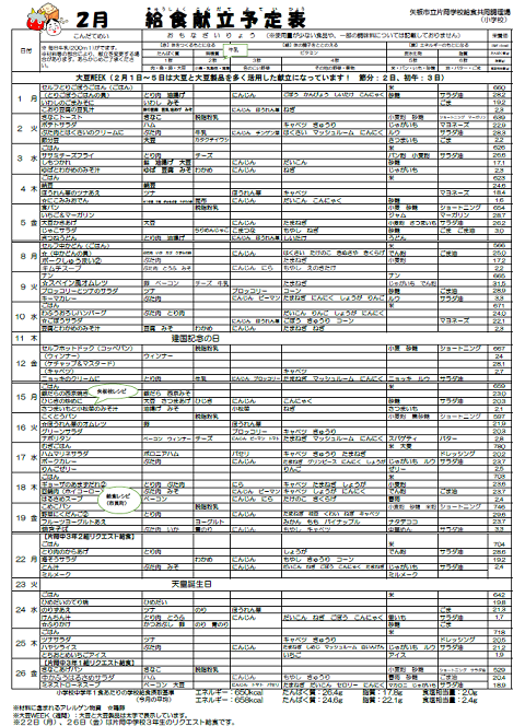 2月分の給食献立予定表を画像ならびにPDFで紹介します。
