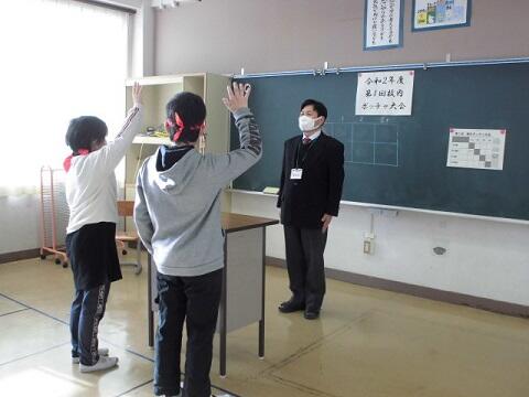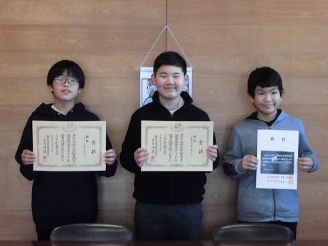 新型コロナウィルス感染症対策のため、入賞者を給食の時間に放送で発表し、昼休みに校長室にて6年生の代表者3名を表彰しました。