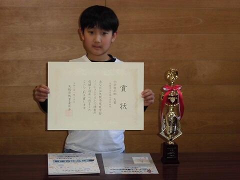 新型コロナウィルス感染症対策のため、入賞者の発表は給食の時間に放送で行い、代表者のみ、お昼休みに校長室で表彰を行いました。本校からは7名の児童が優秀賞を受賞し、1名が大賞を受賞しました。