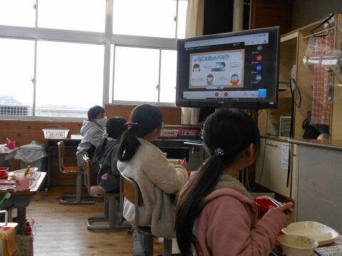 給食の時間にオンラインで保健指導を行いました。今回は、「目にやさしい生活をしよう」というテーマでの保健指導です。
