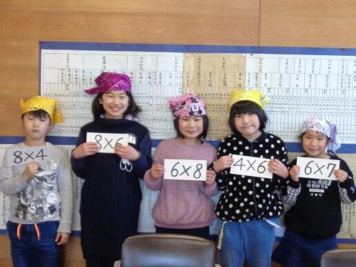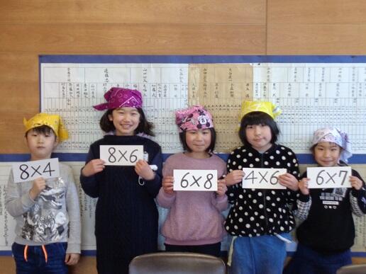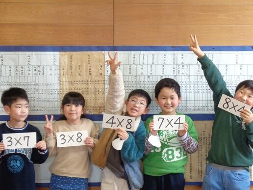 2月13日(月)13:00~13:15 2年生九九検定が始まりました。教室で合格した児童が、毎日数名ずつ校長室を訪れます。校長室では、2~9の段のくじを引いてその段の九九を唱えます。次にアットランダムに3枚の九九カードに答えます。クリアすると合格です。