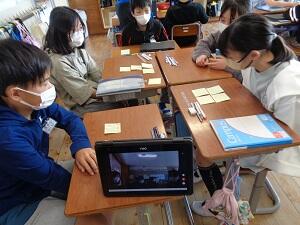 「聞くときに気をつけること」のポイントをもとに、グループ内での議論が活発に展開されました。話し合う様子は、タブレットに録画していく工夫も見られました。