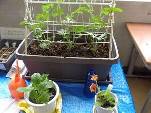 各教室を回ると、さまざまな「緑」を育てていることに気づきます。3組と4組では、ミニトマトや藍を育てています。