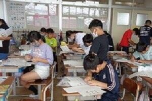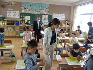ミニ先生となった児童が漢字の読み方や書き順を説明し、担任の先生の指示によって全員で書き順を確かめました。どの児童も真剣に学んでいます。