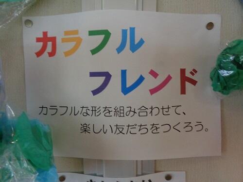 3年生の図工「カラフルフレンド」の作品が廊下に掲示されています。いろいろな色と形を組み合わせ、作品を作りました。