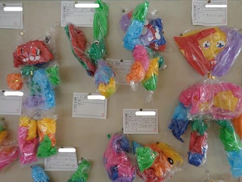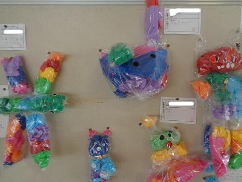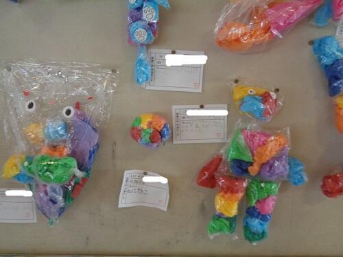 2年生の図工作品。「にぎにぎねん土」という単元で、握ってできた「粘土の形」を使って作品をつくりました。