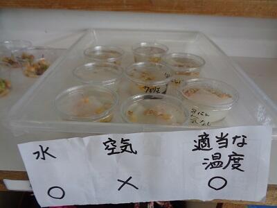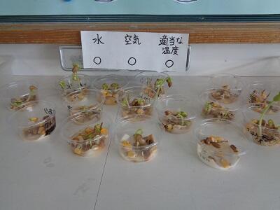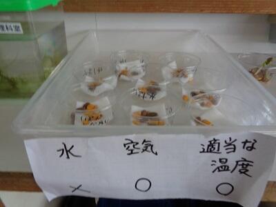 5年生が理科の学習で「インゲン豆の観察」をしています。空気・水・適切な温度のうち、発芽に必要な条件は何かを調べています。