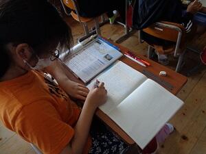 2年生の算数授業の様子。「千までの数をかぞえよう」というめあてで、練習問題を通して数え方・考え方を学びました。担任の先生の授業準備が行き届いて視覚化されており、子ども達は理解を確かなものにしています。