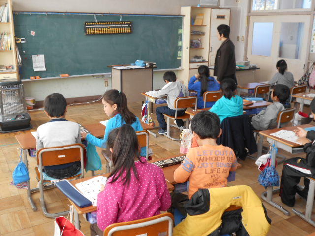 1校時3年1組、2校時3年2組、3校時4年1組、4校時4年2組で、そろばんの学習をしました。