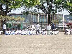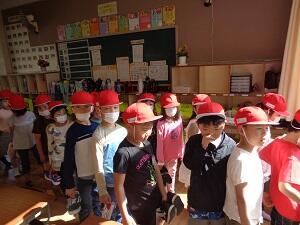 避難経路確認で校庭に出た児童は、担当の先生の話を真剣な態度で聞いていました。