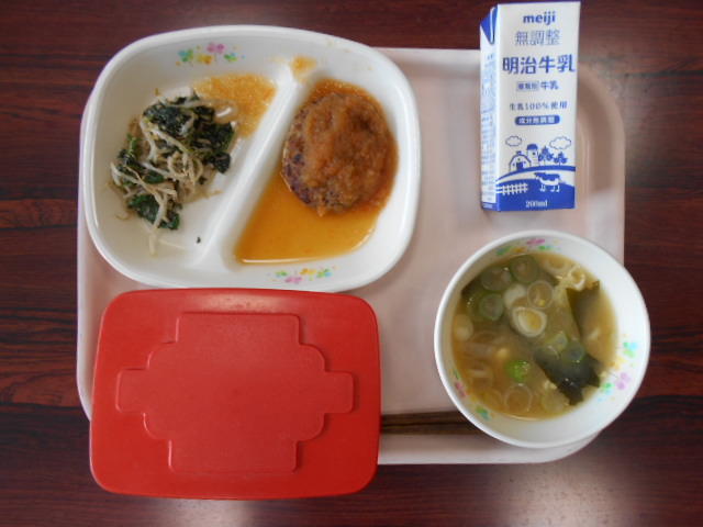 和風おろしハンバーグ、ほうれん草のごま和え、なめこの味噌汁等です。