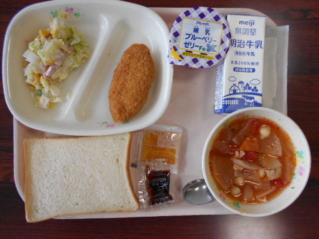 食パン、マーマレード、ささみチーズフライソース、かんぴょうサラダ、ミネストローネ、ブルーベリ-ゼリー等です。