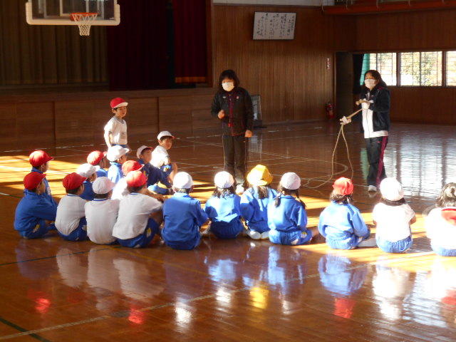 2校時、体育館で1年生が長縄跳びの練習をしていました。