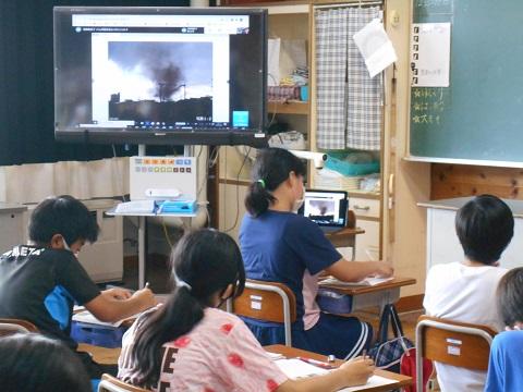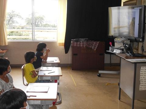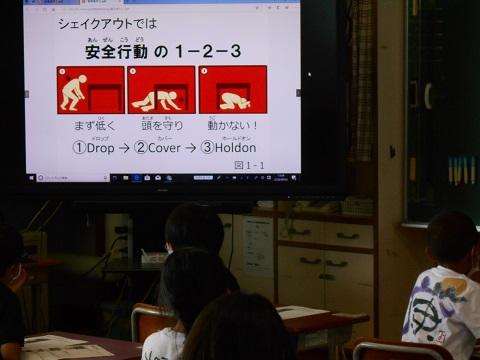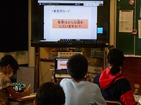 まず、養護教諭から竜巻についての知識が伝えられ、実際の竜巻被害の写真などが見せられると、子供たちはその光景に目を奪われました。そして、竜巻がもし近くで発生した時の対応や安全行動などを図を用いて解説すると、子供たちはメモを取りながら真剣な様子で聞き入りました。