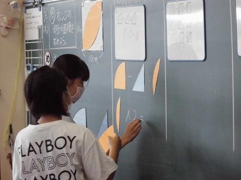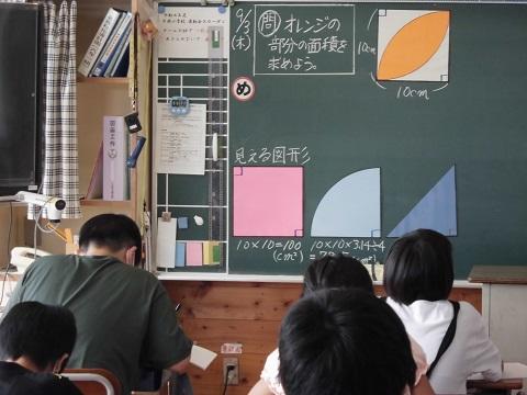 「円の面積の求め方を考えよう」の単元で、本時は色々な図形を組み合わせて、複雑な形の図形の面積を求める方法を考えることをねらいとして授業を展開しました。