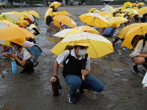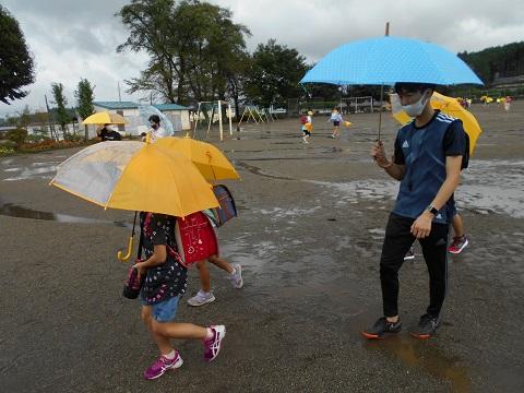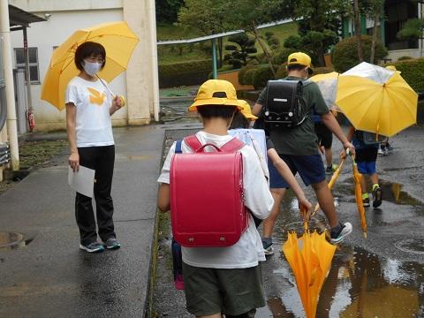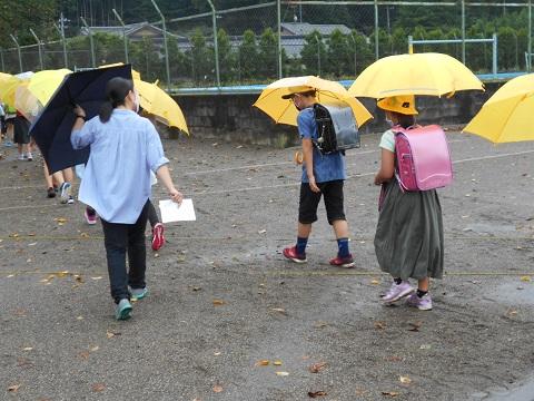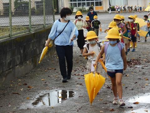 にわか雨の中での集合・下校でしたが、子供たちは班長さんを中心に素早く整列し、下校することができました。