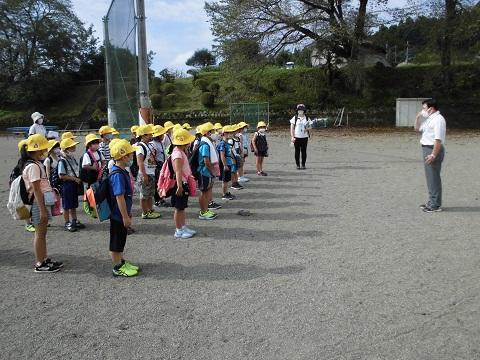 まず、校庭で出発式を行い、担任と校長先生から今日の校外学習のめあてや学んで来てほしいことを伝えました。