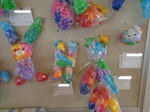 3年生の図工「カラフルフレンド」の作品が廊下に掲示されています。いろいろな色と形を組み合わせ、作品を作りました。