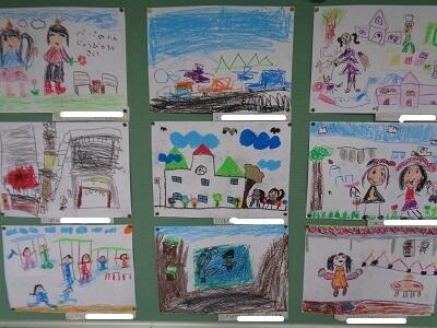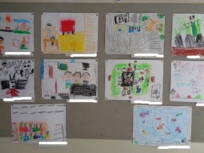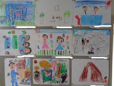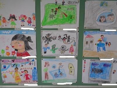 1年生の図工作品。「みてみて あのね」という単元で、楽しかった思い出を絵に表しました。学校やお家で楽しかったことを思い出し、周りの人に伝えたいことをよく頑張って表現しました。