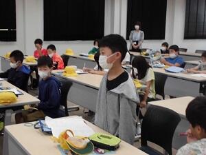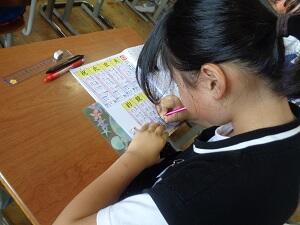 4年生の教室に入ると、デジタル教科書の画面で「漢字の書き順」を指導していました。大画面に映し出された書き順を見ながら、全員で「指書き」をして正しい書き順を覚えました。