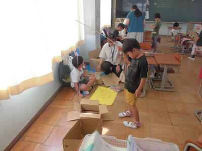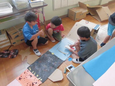 2年生は、生活科の学習でお祭りを計画しています。現在その準備中で、お祭りの催し物(各グループごとにお店を出店する予定です。)で使うものを作っています。みんなで協力し合って制作しています。