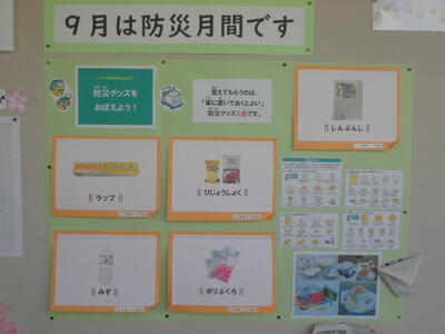 9月1日は防災の日です。防災に関する資料を校内に掲示し、防災に対する意識を高めています。9月3日には、避難訓練(竜巻対応)を実施します。ご家庭でも、防災について話し合ってみてはどうですか。