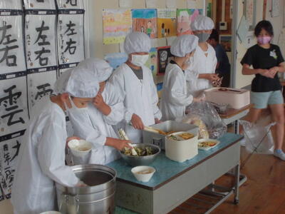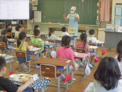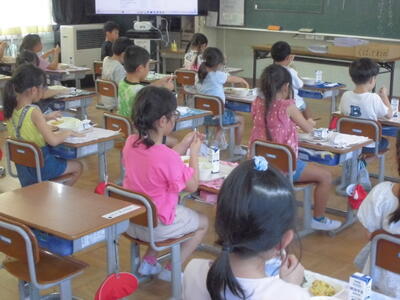 暑い日が続いています。本日の給食は、栄養教諭の先生をはじめ調理員さんのご配慮で、冷たいサラダうどんでした。できるだけ冷たいものを食べさせたいという願いで、氷など工夫をして調理してくださいました。栄養教諭の先生や調理員さん、いつもおいしい給食をありがとうございます。子どもたちの配膳もきちんと行われています。