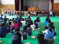 5年生は、「なるほどおじさん」を発表した後、全校生と様々な方法で楽しく群読しました。