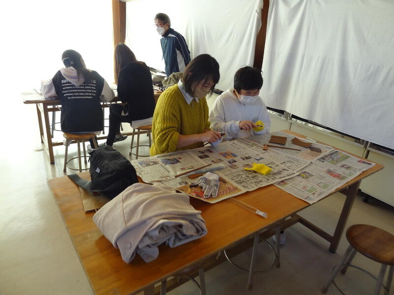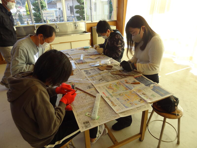 日頃、小刀を使う経験が少ないため苦戦している児童もいましたが、親子で一生懸命作りました。講師とアシスタントとして、学校支援ボランティアの「ぶらぶらクラブ」の皆さんにサポートをいただきました。完成までにはもう少し作業が必要ですが、個性的な「マイ箸」ができそうです。