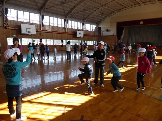 両手に旗代わりの紅白帽子を持ち、集会委員会の「赤上げる」「白上げる」「赤下げないで白下げる」等の号令に合わせて、帽子を上げ下げするゲームでした。全員を二つに分けて行った予選を勝ち残った9人が、全児童の見守る中で決勝を行いました。最終まで残った3人が「旗上げ王」になりました。寒い体育館の中でしたが、楽しいひとときを過ごしました。