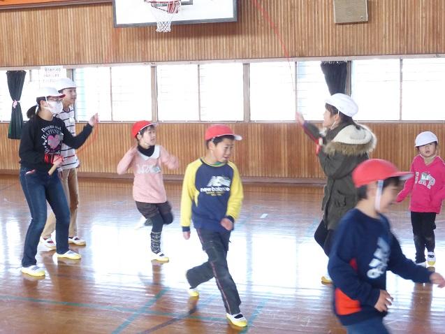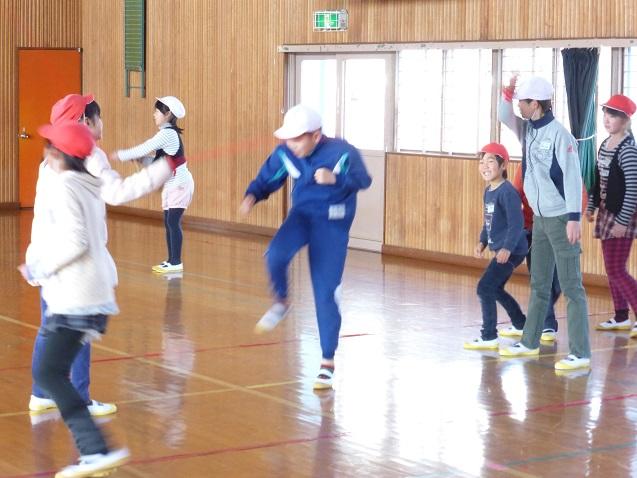6つの縦割り班で行っていますが、4年生は校外学習で益子方面に行っているので、今回は入っていません。3分間で150回を目標に跳び、3つの班が目標を達成しました。回転している縄に入るタイミングが取りにくく苦労していた児童も、上手に跳べるようになってきています。リズム感が大切であることを見ていて感じます。