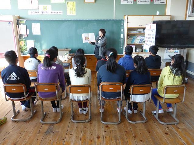 この読み聞かせは、おなはしポットの会の方々に、年間で10回お世話になっています。本日は、読み聞かせの後に各学年の児童が書いたお礼の手紙を、6年生が代表してお渡ししました。会の方々からは、「いつも、しっかり聞いてくれたのでうれしかった。」「中学校に行っても本を読んでくださいね。」等のお言葉をいただきました。掲示物形式にした手紙は、矢板市図書館に掲示してくださるそうです。