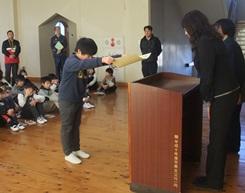 乙畑小学校の2年生は、毎年校長室で、九九名人に挑戦しています。
