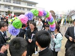 在校生から6年生にメッセージを書いた色紙を贈りました。また歌のプレゼント「世界に一つだけの花」で、全員が一輪の花をもって一生懸命歌いました。