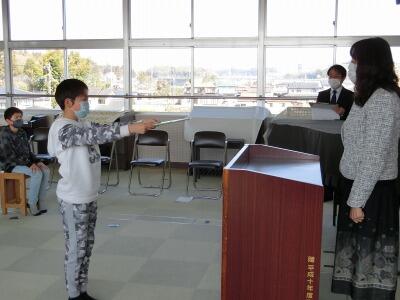 図書コーナーに足を運び、好きな本をたくさん借りる子になってほしいと、いろいろな取組をしてきた成果だと思います。今日はその中でもたくさん借りた人に、図書委員長より賞状がわたされました。おめでとうございます。