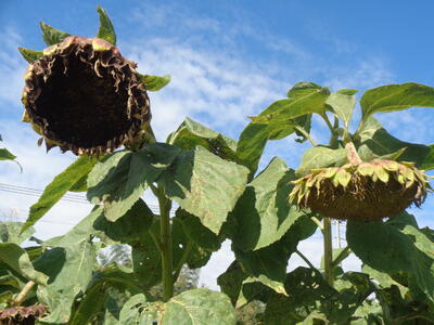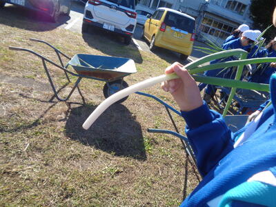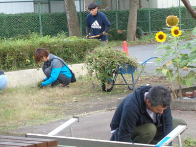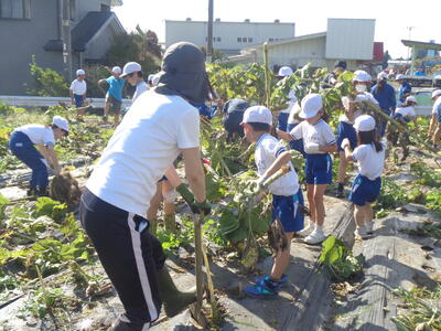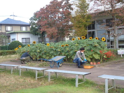 しっかり根を張っているため、根元から折ったり、スコップで掘り起こしたりしました。一人一人が一生懸命働き、あっというまにきれいになりました。1年生が自分より大きなひまわりを一生懸命運ぶ姿も印象的でした。