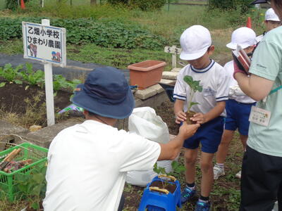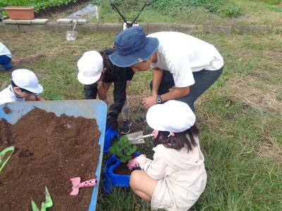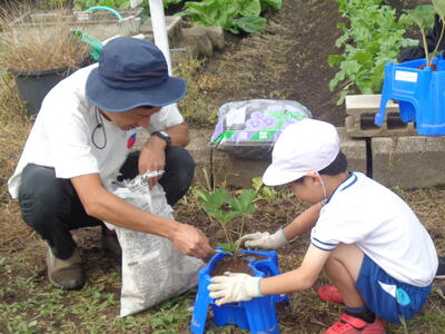 一人一鉢苗を植えた後、「おいしくなあれ」と肥料の魔法をかけていただきました。