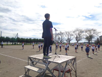 いよいよ、本日から運動会の練習が始まります。初めての全体練習なので、赤白各団長の自己紹介と意気込みを話してもらいました。また、体育主任から、運動会練習を行うにあたっての服装や心構え、取り組み方についてお話がありました。マイクを通さずに大きな声で話す体育主任の姿に、熱いものを感じます。初日なので、姿勢や、声の大きさ等、まだまだ改善していくところはたくさんありますが、一人一人が真剣に取り組む様子が見られました。
