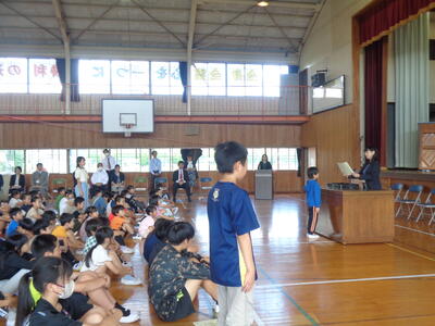 その後、学年の代表児童が作文を発表しました。返事、礼の仕方、声の大きさ、作文の内容、全てにおいて本当に素晴らしかったです。このような機会に、子どもたちは自信をつけ、更に成長していくのだと思います。