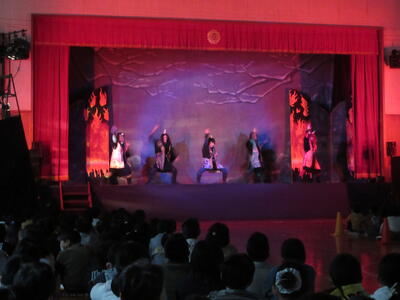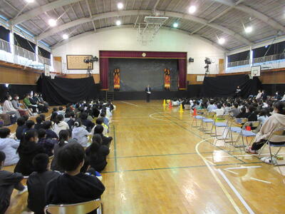 今年度は、片岡小学校と合同で芸術鑑賞会を実施しました。交流という目的の他に、本校が小規模校のため費用の面から今までプロの劇団をお呼びすることができなかったという課題解消の目的もあります。演目は劇団「民話芸術座」による「鬼の小づち」です。私たちは、昔話や民話を通じ、鬼という恐ろしい存在から人間が学ぶことがたくさんあることを知ります。しかし、今日は、劇団の皆さんの大きな声や動き、照明や衣装の工夫に、子どもたちは息をのんで芝居の世界に入り込んでいる様子が見られました。ストーリーに散りばめられた、人間の弱さ・友情・善悪の判断・貫く強さ等を、子どもたちは体感することができたように思います。最後は各校から1名代表児童がお礼の言葉を述べ、花束を贈呈しました。劇団「民話芸術座」の皆様、素晴らしい劇を、ありがとうございました。