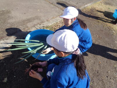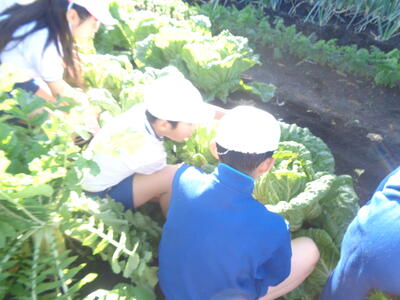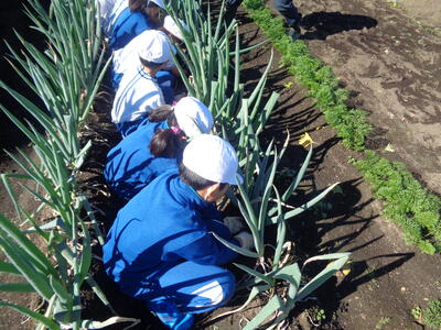 本日、1校時目に3・4年生が白菜、2校時目に1・6年生が大根、3校時目に2・5年生がねぎの収穫を行いました。野菜の大きさや美しさ、みずみずしさを目にし、子どもたちは喜びと驚きの声をあげていました。校舎北側の農園で収穫をし、南側に運んで洗い、家庭科室に運ぶため、もしかしたら体育より運動量が多かったかもしれませんが、全員本当によく働きました。今日収穫した野菜は、14日(金)のひまわり祭の時に保護者ボランティアの皆様に調理していただき、児童・保護者・地域の方・教職員でいただくことになっています。また、一部の野菜は、片岡調理場に送り、給食で使っていただくこととなっています。