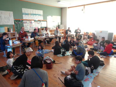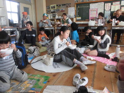 それぞれの会食会場に分かれ、昼食をとりました。保護者ボランティアの皆様に作っていただいたさつま汁(さつまいも入りのけんちん汁)と持参したおにぎりをみんなで楽しく、おいしく、感謝しながらいただきました。さつま汁には、農園ボランティアの皆様にお世話になり子どもたちが育て、収穫した白菜、ねぎ、大根、さつまいもが入っています。