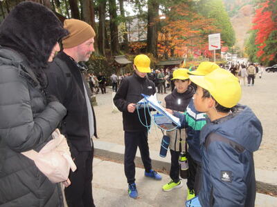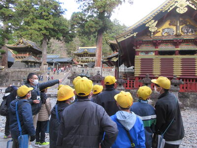 今日は、6年生が、社会科「武士による政治の安定」「国力の充実をめざす日本と国際社会」総合的な学習の時間「日本から世界へ」の学習で日光東照宮と足尾銅山へ行きました。日光東照宮では、英語科で学習したことを生かし、外国の人にどこの国から来たか、なぜ観光場所に日光を選んだかなどインタビューをするミッションがあります。ツアーの観光客に囲まれるグループもありましたが、無事にインタビューを終え、折り紙のプレゼントを渡すことができました。足尾銅山ではトロッコに乗り、坑道内の見学もしました。