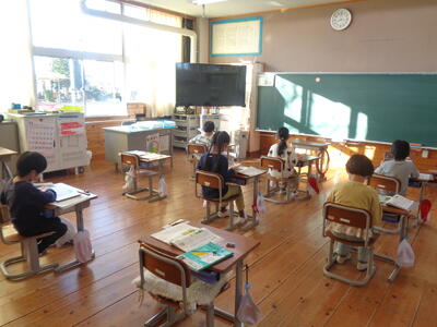 乙畑っ子タイムを活用し、教育相談を行っています。児童が、別室で担任と一対一で話を聞いてもらう時間です。担任は、困っていることや悩んでいることはないかも含め、児童の話をしっかり聞き取り、受け止め、問題の未然防止・早期解決に努めます。その間、待っている児童は、教室で静かに読書をしています。一年生も自力で読書ができるようになりました。