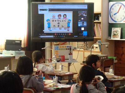 1月30日(月)、全国学校給食週間(1/24~1/30)に合わせて片岡小学校の栄養教諭の先生から給食の歴史など、給食に関するお話をしていただきました(給食の時間・オンライン)。子供たちは、改めて給食の歴史や日本以外の国の給食等について知ることができました。貴重なお話をありがとうございました。