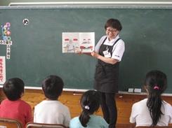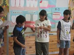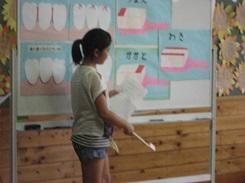 次に。歯の磨き方の復習です。大きな模型を使って説明し、その後音楽に合わせて全校で歯磨きをしました。歯ブラシの先が開いてしまったら、新しい物と交換し、ブラシの先を歯に当てて、みがき残しがないようにみがことが大切です。歯は一生使う大切なものです。正しく磨いて、虫歯があったらすぐに治療しましょう。