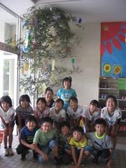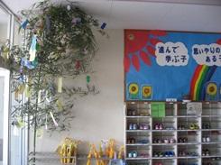 今日は七夕です。本校の児童昇降口にも大きな飾りができあがりました。4年生が、学級会で七夕飾りをつくることを決めました。全校児童に声をかけて短冊をかいてもらうなど、4年生が中心となって、つくりました。みんなの願いがかないますように。