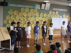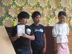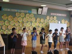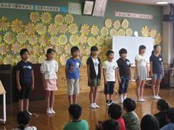 今日の朝の活動は、5年生による音読集会でした「。かぐや姫」「かぐや姫古典バージョン」「 奥の細道」「じゅげむ」の発表でした。絵本を使って紹介したり、身振り手振りも使ったりして、とても楽しく古典の世界を表現していました。8人の息がぴったり、笑顔で発表していて、見ている私達もとても楽しい気持ちになりました。