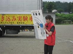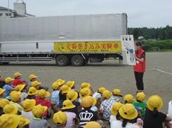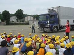 本日2校時に「第2回交通安全教室」が行われました。今回は市交通教育指導員さん、乙畑駐在所さんだけでなく、トラック協会の方にも指導をお願いしました。大型トラックを持ってきていただき、実演を交えての学習となりました。ダミー人形が車にひかれてしまう実演はとてもショッキングでしたが、事故は身近なものであり、事故に遭ったら大変なことになってしまうという事を実感することができました。駐車車両の横から横断するときの注意や大型トラックの巻き込み事故の実演、トラックの運転手さんの死角に入らないこと、ヘルメットの正しいかぶり方などたくさんの事を学ぶことができました。